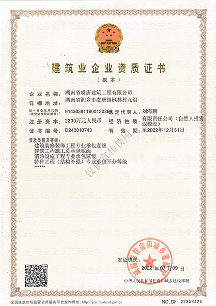 本公司具有建筑工程施工總承包貳級、消防設施工程專業承包貳級、建筑裝修裝飾專業承包壹級、特種工程(結構補強)專業承包不分等級、